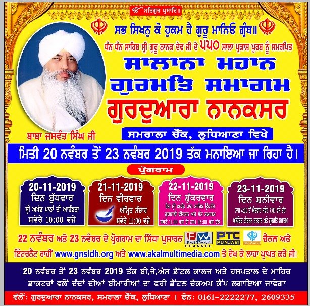 gurduAwrw nwnksr, smrwlw cONk, luiDAwxw ivKy hr swl hI swlwnw gurmiq smwgm ’qy dyS ivdyS dIAW sMgqW dw TwTW mwrdw smuMdr phuMc ky syvw ismrn krdw hY[ sRI gurU gRMQ swihb jI dI Cqr CwieAw hyT ienHW swlwnw smwgmW qy Kwlsw pMQ dy q^q swihbwn qoN jQydwr swihbwn, pRDwn swihb, SRomxI gurduAwrw pRbMDk kmytI, AMimRqsr, sMq smwj dy mu¤KI, pRis¤D Dwrimk qy smwijk S^sIAqW Aqy rwjnIiqk pwrtIAW dy pqvMqy s¤jx phuMcdy hn[ pMQ dy pRis¤D kIrqnI jQy, FwfI jQy, kQwvwck, ivAwiKAwkwr, kvI swihbwn Awid gurU sMgqW ƒ gurbwxI Aqy gur ieiqhws suxw ky gurU crnW nwl joVdy hn[ swlwnw smwgm smyN hzwrW pRwxI AMimRq Ck ky gurU vwly vI bxdy hn[ ienHW gurmiq smwgmW smyN bwbw jI is¤K isDWqW, is¤K rvwieqW Aqy pMQk rihq mrXwdw Anuswr sMgqW ƒ Sbd gurU nwl joVn Aqy kQw kIrqn, gurbwxI pwT rwhIN jigAwsUAW ƒ Awqimk Kurwk pRwpq krn dy suihrd auprwly krdy hn[ bwbw jI vloN is¤KI isDWqW, is¤K i&lws&I Aqy is¤KI mwrg qy c¤lx vwly pRcwrkW, ivdvwnW, swihqkwrW Aqy inSkwm kIrqnIAW ƒ snmwinq vI kIqw jWdw hY[